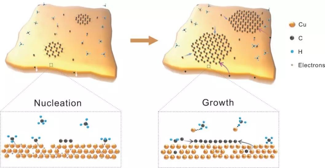 液态金属是理想的石墨烯生长天然基底,可同时实现石墨烯的低密度成核和快速生长。液态金属催化剂具有准原子级平滑表面、高扩散速率,可避免固态金属基底固有的缺陷和晶界。液态铜中丰富的自由电子可以加快石墨烯的成核速度,促使石墨烯秒速成核。同时,各向同性的平滑表面大大抑制了石墨烯的成核密度。此外,由于液态铜具有优异的流动性,加速了碳原子在基底表面的传质,进一步促进了石墨烯的快速生长。