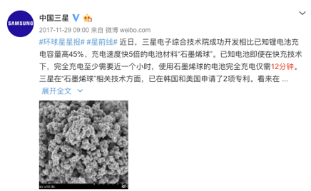 无独有偶,三星在2017年开始便申请了大量石墨烯有关的专利,在当年年底宣布在在石墨烯电池领域取得了新的突破,报道称该方案比锂电池电荷高了45%,充电速度可达目前锂电池的5倍,手机可以在12分钟内完成充电,而且具有超强的蓄电能力。据悉,三星将有望2019年年底的手机上采用石墨烯电池。