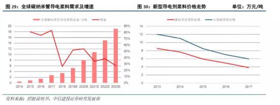 2017年导电碳黑价格约4.3-4.5万元/吨,以导电浆料固形物含量4%计,导电碳黑添加量是新型导电剂3倍计,2017年碳纳米管导电剂和石墨烯导电剂成本分别约是导电碳黑的7.2、11倍。