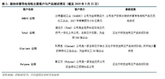 公司以市场为导向,坚持自主创新,投入大量研发资金用于导电塑料与导电母粒相关领域研究,将其视为公司第三代核心产品,积极开展对碳纳米管下游产业链的延伸。目前,公司已经和SABIC、Total、Clariant、Polyone等多家知名国际化工企业建立紧密合作,取得了导电母粒技术突破并已经基本完成相关产品的商业化测试,特别是公司已经与SABIC公司进入了实质性供货报价阶段。在自有技术逐渐成熟的同时,公司2019年拟在科创板公开发行股票募集5亿资金用于“石墨烯、碳纳米管与副产物氢及相关复合产品生产项目”。通过该项目,公司计划在常州市武进区建厂生产2000吨碳纳米管导电母粒,将公司已积累的导电母粒先进技术转化为可观的业绩收入。该项目建设期为2年,预计2021年下旬投产。随着公司碳纳米管导电母粒实现量产并逐步放量,碳纳米管导电母粒有望发展成为公司新型主力产品,与导电浆料共同构成公司业绩增长双引擎,成为公司未来新的业务支柱。