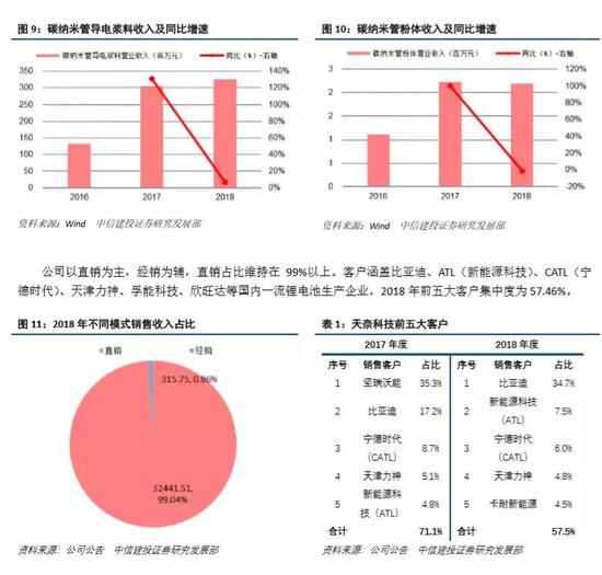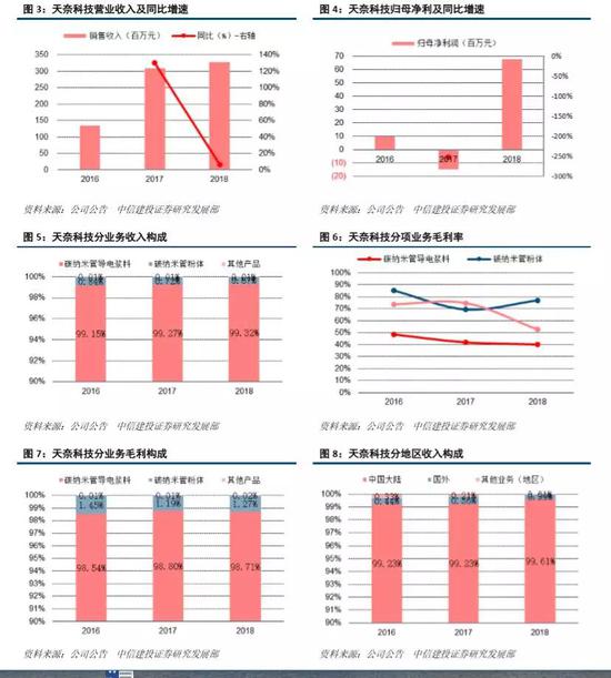 2018年,公司实现收入3.28亿元,同比+6.4%。实现归母净利润0.68亿元。收入构成中碳纳米管导电浆料/碳纳米管粉体分别占比99.3%/0.7%。2016-18年,碳纳米管导电浆料毛利率由48.7%降至40.1%,主因原材料成本上涨(17年起占比超过80%的NMP价格大幅上涨)、产品价格下降(主因17年导电浆料规模化、市场竞争加剧,但18年公司二三代高端产品需求上升带来均价提升)。碳纳米管粉体占比小,以出口供客户研发为主,毛利率虽有下滑,18年仍高达 76.9%。受益于国内新能源汽车的迅速发展,公司收入主要来自国内,2018年占比99.6%。目前公司已加强与日韩企业的开发合作,预计外销收入占比会有一定提升。