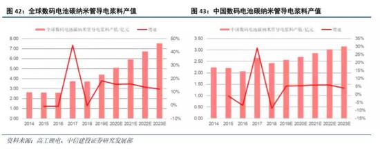 从应用端来看,全球及中国碳纳米管快速增长的主要原因是中国三元动力电池需求快速增长带动,另外日韩企业目前数码锂电池和硅基负极领域也有部分应用。GGII预计未来五年,全球CNT导电浆料需求量将保持40.8%的年复合增长速度,2023年需求量将达19.06万吨。