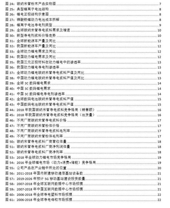 相对传统的炭黑、石墨类导电剂,碳纳米管导电剂性能优越添加量少,且由于碳纳米管比表面积较低,分散性能较好,能够有效解决团聚问题。综合来看碳纳米管导电剂能够使电池充放电、循环性能有效提升,且由于添加量减少能够间接增加电池能量密度。据高工锂电统计,2018年碳纳米管导电剂在动力锂电、3C锂电中的渗透率分别为32%、18%,至2023年将分别提升至82%、32%,带来市场空间的迅速扩大:2018年全球及国内动力锂电碳纳米管导电剂市场空间分别为8.8、8.5亿元,至2023年将分别增长至48、34亿元,复合增长率分别达到40%、32%;2018年全球及国内3C锂电碳纳米管导电剂市场空间分别为3.72、2.43亿元,至2023年将分别增长至7.52、3.15亿元,复合增长率分别达到15%、5%。