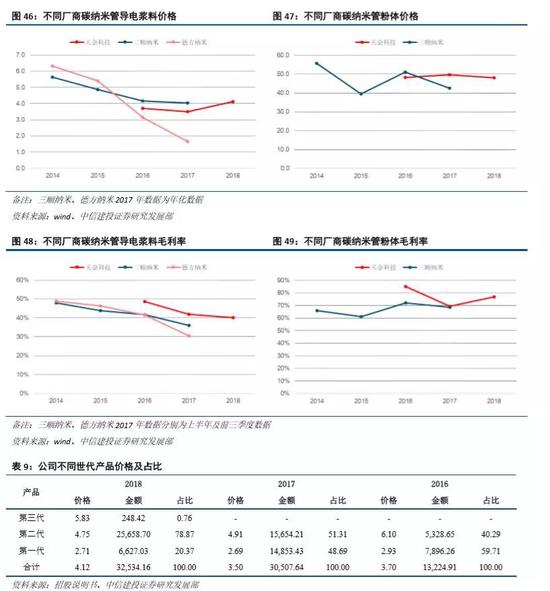 从产品价格来看,公司碳纳米管导电浆料产品价格介于三顺纳米和德方纳米之间,在科比区间之内,价格变动趋势与三顺纳米基本相同。由于生产规模的持续扩大及成本的逐步降低,碳纳米管导电浆料的价格基本呈现持续下降的态势,公司2018年产品价格有所上升,主要是由于高世代产品占比提高所致。