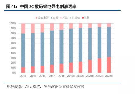 由于3C数码电池品质分化较动力电池更高,高端电池中碳管导电剂在2017年的渗透率就已经达到50%以上,然而3C数码中低端产品价格敏感性更强,仍以使用低价炭黑为主,因此综合来看,碳管导电剂在3C数码电池中的渗透进度不及动力电池,炭黑仍将占据大部分市场,但碳管导电剂的渗透率仍然在持续提高。据高工锂电数据,2018年我国3C数码电池中碳管导电剂渗透率达到18%,同比增加1.6个百分点,预计至2020年将达到22.6%,2023年将达到31.9%。