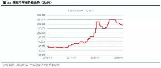 苯醚甲环唑自 1989 年上市以来,销售额一直保持上升趋势。2003 年以前,苯醚甲环唑一直由先正达公司 独家登记注册。2003 年,我国的杭州龙宇化工公司完成了苯醚甲环唑原药和 25%苯醚甲环唑乳油的小试,并于 2003 年 12 月份通过了鉴定验收工程,标志着我国企业正式进入苯醚甲环唑生产领域。随后,江苏耕耘和安徽 绩溪农华公司也相继开发出了苯醚甲环唑的原药和制剂,促进了苯醚甲环唑的发展。目前,我国苯醚甲环唑的 产能为 7800 吨。2017 年以来,受环保压力的影响,小企业开工率不足,再加上耕耘化学装置检修,苯醚甲环 唑供不应求,导致市场价格持续上涨并维持高位。