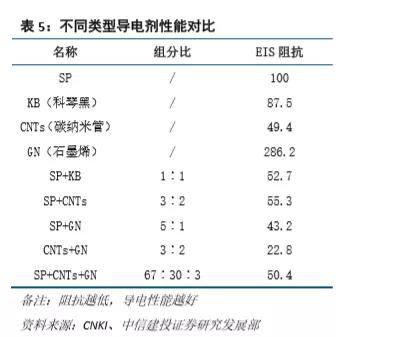 碳纳米管性能优越、石墨烯潜力巨大:我们通过查阅文献总结了常见的导电剂及其复配产物的导电性能汇总于下表中,以SP电池的EIS阻抗为基准100,阻抗越低表明导电性能越好。可以看到,碳纳米管导电剂的性能显著优于SP、KB等传统导电剂;碳纳米管与石墨烯的混合导电剂性能极为优越,但成本较高;经典导电剂SP与石墨烯的混合导电剂SP+GN、SP+CNTs+GN等性能优越,石墨烯作为下一代导电剂组分的潜力巨大