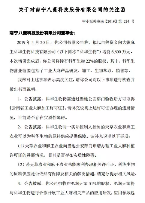 函件显示,4月20日,八菱科技披露公告称,拟以自筹资金向大姚麻王科华生物科技有限公司(简称“科华生物”)增资6600万元。增资完成后,公司将持有科华生物22%的股权。其中,科华生物营业范围包括了工业大麻产品研发、加工、生物萃取、销售等。深交所对上述事项表示高度关注,并就十项问题进行问询。