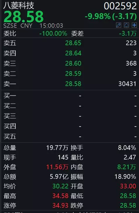 按此时间计算,4月22日正是黄志强与陆晖的计划减持起始日。巧合的是,公司在前一个交易日(4月19日)晚间披露了布局工业大麻计划。八菱科技在4月22日出现跌停,以28.58元/股收盘。