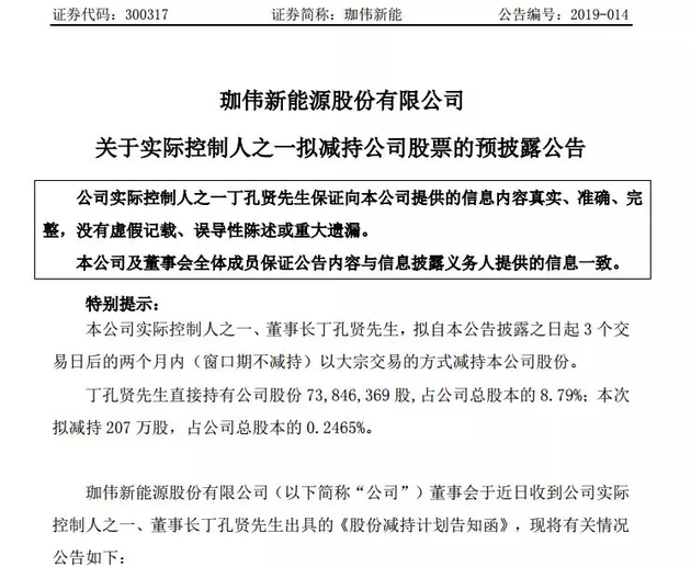 值得注意的是,在公司股价“起飞”狂夸石墨烯的一个月前,珈伟新能披露了一则减持预披露公告。公司实际控制人之一、董事长丁孔贤拟自公告披露之日起3个交易日后的两个月内(窗口期不减持)以大宗交易的方式减持公司股份。丁孔贤直接持有公司股份7384.64万股,占公司总股本的8.79%;本次拟减持207万股,占公司总股本的0.2465%。