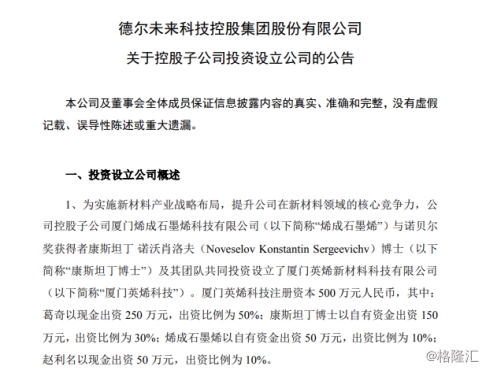 值得一提的是,德尔未来成立于2004年12月,2015年涉足石墨烯新材料领域,自此开启了“智能互联家居产业+石墨烯新材料新能源产业”双主业的发展战略,其中,德尔未来控股子公司烯成石墨烯是国内较早从事石墨烯制备设备、及石墨烯产品应用开发研究的高科技企业;此外,康斯坦丁博士长期从事石墨烯相关领域的研究,因发现在石墨烯实验上的突破性贡献与安德烈·海姆一同获得2010年诺贝尔物理学奖。