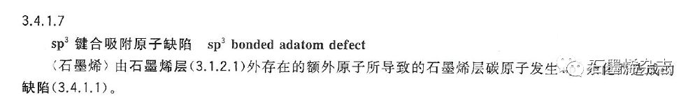 (3.4.1.7)“Sp3键合吸附原子缺陷”的解释:(石墨烯)由石墨烯层(3.1.2.1)外存在的额外原子所导致的石墨烯层碳原子发生sp3杂化而造成的缺陷(3.4.1.1)。那么二层石墨烯的sp3键合吸附原子缺陷算不算sp3键合吸附原子缺陷呢?还有其他的石墨烯衍生物的sp3键合吸附原子缺陷算不算sp3键合吸附原子缺陷呢?因此建议把表述改为:石墨烯及其衍生物由石墨烯层(3.1.2.1)外存在的额外原子所导致的石墨烯层碳原子发生sp3杂化而造成的缺陷(3.4.1.1)。这样可能较为合理。