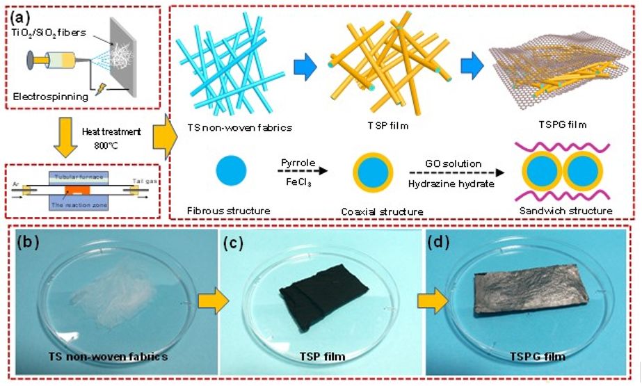 图1.(a) 高性能柔性电磁屏蔽复合薄膜的制备过程.(b–d) 通过吡咯原位沉积、氧化石墨烯自组装法在不同尺度上形成具有双连续导电网络结构和夹层结构的轻质柔性电磁屏蔽复合薄膜。