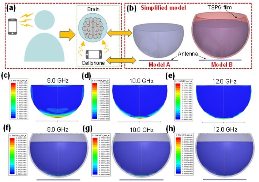 图3人体大脑暴露于手机电磁辐射的模拟过程:(a)模拟大脑模型示意图。(b)简化的电磁辐射模型。(c-e)大脑直接暴露在电磁辐射中的电场分布云图。(f-h)具有复合薄膜保护作用时大脑中的电场分布云图。
