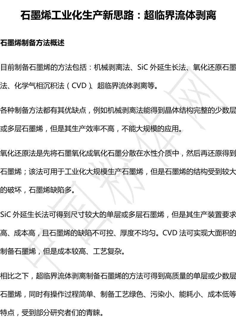 石墨烯工业化生产新思路:超临界流体剥离 石墨烯网 • 2019年5月8日 16:00 • 研报资料 • 阅读 3314 超临界流体剥离制备石墨烯法实现了对石墨烯层数的可控制备,且工艺简单、成本低、设备要求不高,在大规模生产石墨烯中具有较好的潜力,这将为工业化的生产石墨烯提供一条新的路径。 本文来自中国粉体网,本文观点不代表石墨烯网立场,转载请联系原作者。 超临界流体 赞 (0) 石墨烯网 0 生成海报 结合科创板估值看石墨烯企业碳世纪的商业价值 上一篇 2019年5月8日 提供宿舍!发展前景好!永安这家石墨烯科技企业招聘啦 下一篇 2019年5月8日 相关推荐 关于污水管线防腐的详解! 2021年1月8日 3.2K000 研报资料 走进石墨烯小世界之石墨烯气凝胶 2020年12月15日 2.5K000 研报资料 【八大事项】股权转让协议应注意,防患于未然(董秘必备) 2021年4月12日 1.8K000 研报资料 PPT丨石墨烯在储能领域的应用 2019年12月18日 2.7K000 研报资料 酷暑大“烤”已来,提升电线电缆耐候、阻燃、防开裂等性能的N种方式,哪个最有效? 2023年7月19日 1.3K000 研报资料 SA:Q1苹果iPad OS出货量同比下降6%至1580万台 2022年5月7日 1.2K000 研报资料 欧盟石墨烯旗舰发布2019年工作报告 2020年4月14日 1.9K000 研报资料 中国、欧洲未来10年石墨烯科技路线图 2016年3月15日 2.3K000 研报资料 新材料分析:电子产品散热材料(石墨散热膜)并非越薄越好 |【富海分享】 2017年6月24日 8.9K000 研报资料 发表回复 请登录后评论...登录后才能评论 提交