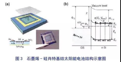 2009 年,Li 等研发了一种新型的太阳能电池结构,该结构采用石墨烯作为电极的阳极,并与硅半导体结合,形成了石墨烯- 硅肖特基结太阳能电池结构,其具体结构图,如下如图3 所示。在Si/SiO2 基片上,覆盖有一层很薄的石墨烯,并且在石墨烯薄膜上方,有约0.1-0.5cm2 面积的硅层窗口,四周以金线作为栅。