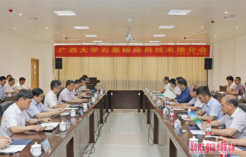 5月23日, 广西大学石墨烯应用推介会在广西石墨烯研究院举行。活动由 广西大学与自治区国有资产监督管理委员会联合举办。 自治区国有资产监督管理委员会党委副书记、副主任、巡视员聂江武,广西大学副校长马少健 出席会议, 总会计师宁旭初主持会议。