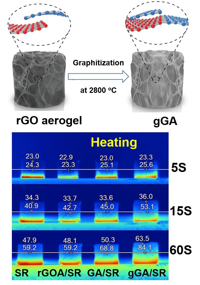 本团队则开发了一种简单有效的方法,制备了弹性高导热石墨化石墨烯气凝胶/硅橡胶(gGA / SR)复合材料。受焊接的启发,首选通过高温石墨化(2800℃)设计和制备了具有高热导率的3D连续石墨烯骨架。XRD和Raman光谱的结果证实,石墨烯的晶格缺陷通过石墨化得到显著修复且碳原子结晶度得到改善,从而形成了高导热网络;此外,石墨烯片之间的简单的物理范德华力转化为化学共价键的键合,从而获得具有真正3D互联网络的gGA,从而减少界面声子散射,加速热量的传导。这表明石墨化后的石墨烯气凝胶是用于增强先进热管理材料散热性能的有效导热骨架。
