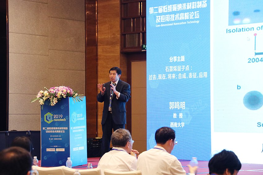 西南大学化学与化工学院郭鸣明教授作了《石墨烯量子点:过去,现在,将来;合成,表征,应用》的报告,在报告中他为我们讲述了石墨烯量子点的优势和潜在应用领域以及当前石墨烯量子点产业应用的局限在哪里,为进一步的产学研攻关指明了方向。