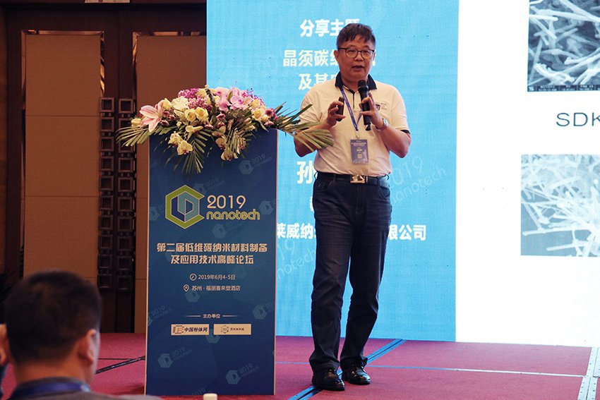 江西克莱威纳米碳材料有限公司孙晓刚教授激情澎湃地向我们介绍了他所带领的科研团队历经20余年所取得的突破性成果——晶须纳米管,该型碳纳米管独辟蹊径地摆脱了传统化学方法制备的弊病,同时其优良的性能处于国际领先地位,在向我们介绍晶须型碳纳米管的物理性质的同时,孙晓刚教授也展望了该型碳纳米管广阔的的商业前景。