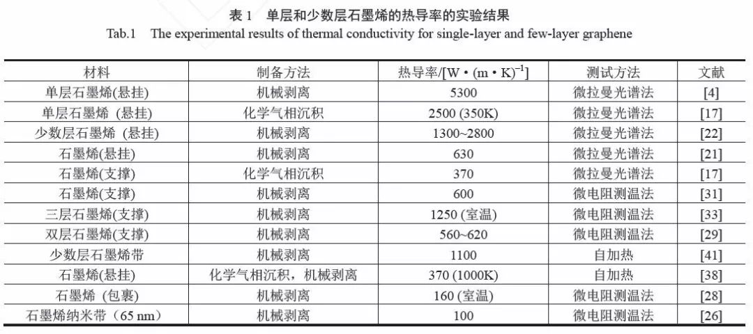 目前,实验上热学性质的测试主要分两种形式,即悬挂石墨烯和支撑石墨烯。前者石墨烯两端固定,其余部分处于自由状态;后者整个石墨烯片和基底接触。实验测定石墨烯热导率的方法主要有光热拉曼法、微电阻测温法、光热反射技术和自加热法等。表1 总结了部分不同方法测得的单层和少数层石墨烯热导率。另外,北京大学白树林等也对石墨烯的热性能和表征技术做了一些总结。