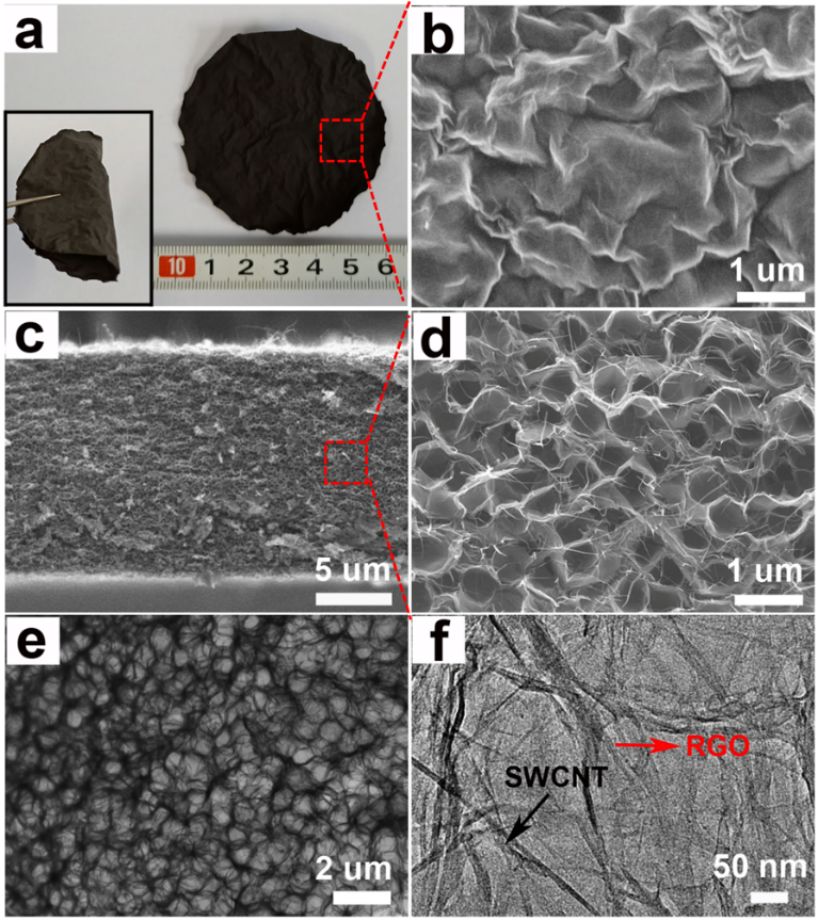 ▲Fig. 1. (a) The digital photograph of a freestanding and flexible film of e-RGO-SWCNT (0.6) with the inset showing a folded film; (b) SEM image of the e-RGO-SWCNT (0.6); (c) Low-magnified SEM images of e-RGO-SWCNT in cross section; (d) High-magnified cross sectional SEM image of the red square in (c); (e, f) TEM and HRTEM images of e-RGO-SWCNT(0.6) film after calcination.