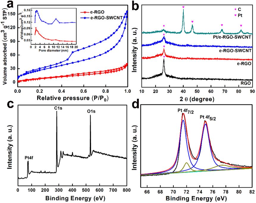 ▲Fig. 3. (a) N2 adsorption-desorption isotherms of e-RGO and e-RGO-SWCNT. The inset is the corresponding pore size distribution curves; (b) XRD patterns of RGO, e-RGO, e-RGO-SWCNT and Pt/e-RGO-SWCNT; XPS survey spectra of Pt/e-RGO-SWCNT paper (c) full scan, and its XPS spectrum corresponding to binding energies of (d) Pt 4f.