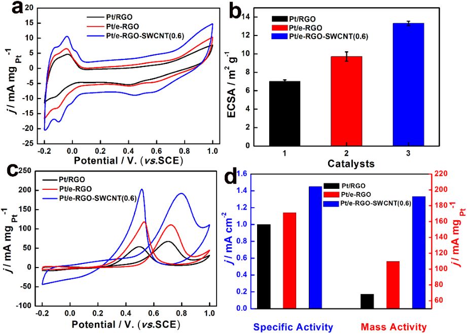 自支撑柔性膜材料(e-RGO-SWCNT)作为载体负载 Pt 纳米粒子用于甲醇催化性能表现出较高的电化学活性面积。用不同粒径的 PS 作为模板制备的具有不同孔径的 Pt/e-RGO-SWCNT 多孔自支撑膜研究结果显示,600 nm 孔径的 Pt/e-RGO-SWCNT 自支撑膜对甲醇催化氧化具有最高的单位质量峰电流密度和单位活性面积峰电流密度。同时,和 Pt/RGO 和 Pt/e-RGO 对比,Pt/e-RGO-SWCNT 自支撑膜具有较高的催化性能以及稳定性。重要的是,Pt/e-RGO-SWCNT 自支撑膜膜材料可作为一种性能优异的柔性电极材料,其催化性能不受膜材料折叠的影响,由于不需要外加电极或集流体,这为其在柔性燃料电池应用提供了可能。