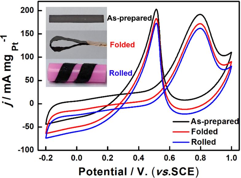 ▲Fig. 5. CVs of Pt/e-RGO-SWCNT catalyst toward MOR in 0.5 M H2SO4+1.0 M CH3OH at 50 mV s−1 with different deformed states: as-prepared, folded, and rolled. Note that the rolled film was immobilized on insulating plastic substrates.