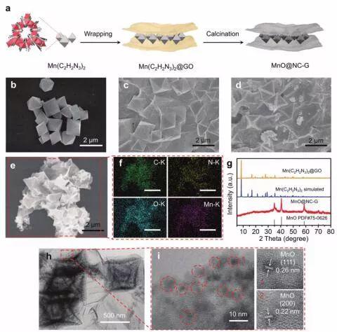 图1 (a) MnO@NC-G的合成路径。(b) Mn(C2H2N3)2 颗粒,(c) GO包裹的Mn(C2H2N3)2,(d, e) MnO@NC-G。(f) MnO@NC-G的EDS元素分布。(g) 材料的PXRD图。(h) MnO@NC-G的 TEM 图 和 (i) HRTEM图。