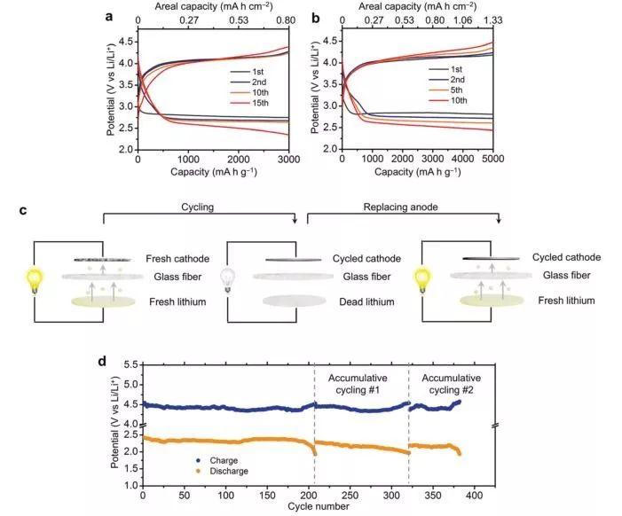 图4 (a-b)在200 mA g-1的电流密度下,不同截止容量时,MnO@NC-G电极的充放电循环性能,(c) 更换负极后工作的Li-CO2电池的示意图;(d) 在1000 mA g-1的电流密度下MnO@NC-G的循环性能。