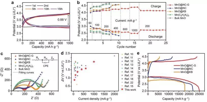 图3a 为MnO@NC-rGO的充放电曲线。电池的放电和充电电压分别为3.07 V和3.95 V,ΔV 为0.88 V,低于大多数已报导的材料。图3b显示,随着电流密度的增加,即使在1000 mA g-1下,电池也可以在2.5-4.5 V的电压范围内工作;当电流密度回到200 mA g-1时,放电电压和充电电压完全恢复,证明在电流突变时正极具有较高的稳定性。如图3b,3c所示,其它四种Mn( II )基电极相比于MnO@NC-rGO都具有更大的ΔV和电荷转移电阻。MnO@NC的ΔV值高于MnO@NC-G,表明石墨烯掺入促进了电荷转移,使得材料倍率性能和循环稳定性显著提升。兼具单分散的Mn(II)活性位点和MOF多孔特征的MOF衍生样品MnO@NC-G和MnO@NC的放电容量均超过了20000 mA h g-1(图3e),且MnO@NC-G的库伦效率达到95.2%,表现出优异的可逆性。综合以上结果可得,在低倍率时(﹤200 mA g-1),(1)和(2)的等级高对于获得低ΔV是至关重要的,具有出色的(2)和(3)则会使材料具有优异的倍率性能, 库仑效率和循环稳定性。