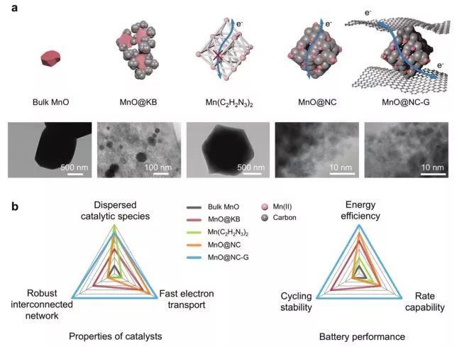 图2(a)用于Li-CO2电池的不同Mn(II)催化剂的结构特征示意图及其相应的TEM图像,(b)它们的材料性质和电池性能的对比。