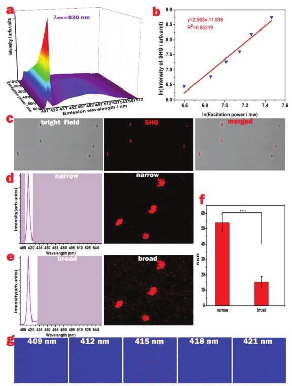 a) 随着功率的增加,在830nm激发下的SHG信号频谱;