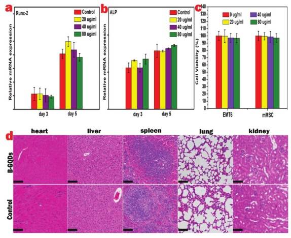 图3 B-GQDs对小鼠干细胞的成骨分化的影响以及B-GQDs的细胞毒性评价