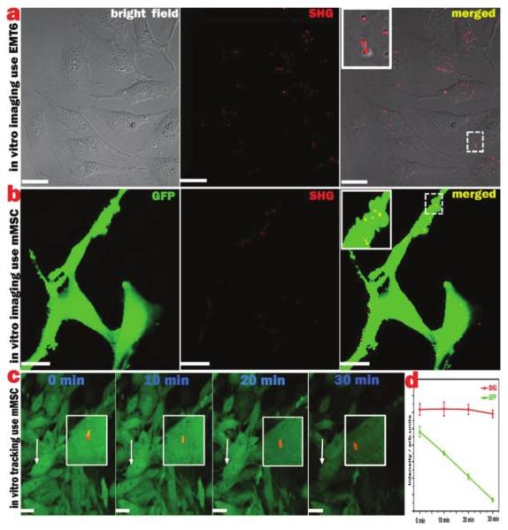 a) 使用带B-GQDs的EMT6细胞的SHG图像。红点为B-GQDS的SHG;