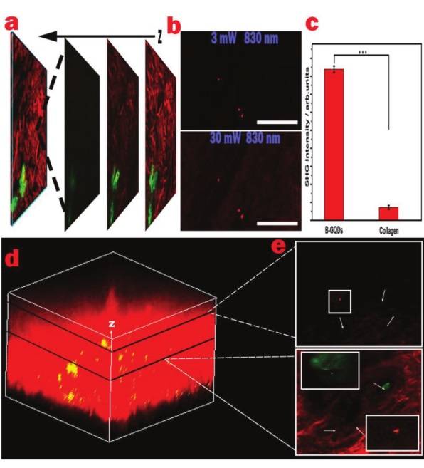 研究者通过掺杂硼原子(≈11纳米和单碳原子厚度)制备了一种新的石墨烯量子点,它产生了一种强SHG非线性光信号。无探头用于SHG成像和跟踪。并且进一步证明了B-GQDS在体外和体内对干细胞无毒性。B-GQDs表现出良好的生物相容性和长期的光稳定性,可以在伤口愈合模型中成功跟踪皮肤组织35天以上。研究者认为这种具有高生物相容性和量子点尺寸的新材料可以作为一种有前途的用于成像和长期跟踪的SHG纳米探针。