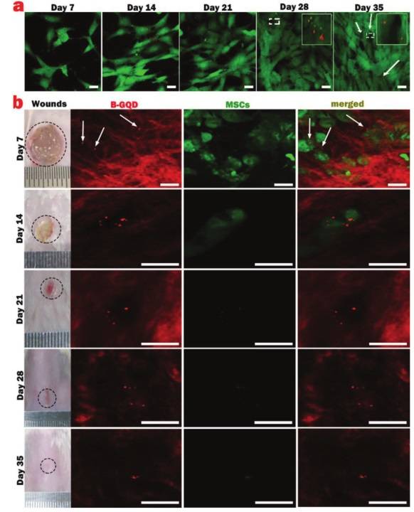 b)在7天、14天、21天、28天和35天之后,将mmsc–adm植入100–200μm深度的小鼠皮肤伤口后的体内跟踪。红色:胶原蛋白形成的SHG;亮点:B-GQD形成的SHG;绿色:MMSCs的GFP产生的荧光。比例尺为20微米。