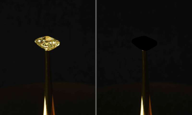 图片说明:工程师们研制出一种由碳纳米管制成的材料,比之前最黑的材料还黑10倍。新材料作为纽约证券交易所新展览装置的一部分展出。该艺术装置名为“虚荣的救赎”,科学家在一颗价值200万美元、重约16.78克拉的天然黄色钻石上涂上了这种新材料。使用涂层后,通常令人眼花缭乱的宝石“变身为”一种扁平的黑色物体。图片来源:物理学家组织网