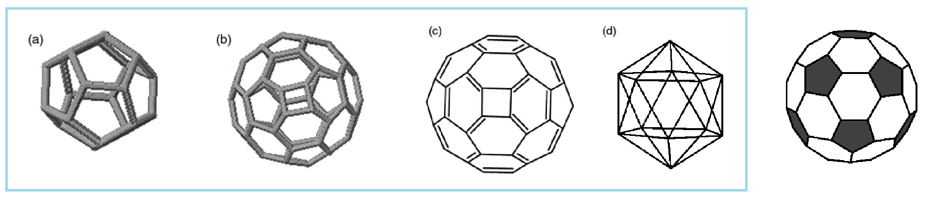 碳的同素异形体结构,还有碳纳米管、石墨烯、和富勒烯等,基本上都以类似的平面正六边形结构为主,有时也混杂了一些五边形和七边形。这些不同结构各有特点,如果忽略很小的纳米尺度,从几何维数来分类,可以将碳纳米管看成是1维结构,石墨烯是2维结构,富勒烯则可以算是点状的0维结构,如图1-4-2所示。最典型的富勒烯是拥有60个碳原子的巴克球C60,其结构与一个现代足球类似。当然,正如在本系列第一篇评论中,网友石磊所提醒的,最简单的一维碳链、一个碳原子(0维)等,也都应该算是碳原子家族的一份子,不过难以制备出来,且尚未有实际应用而已。