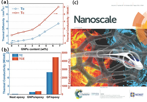 图1 (a) 环氧复合材料导热系数与石墨烯含量的关系;(b) 环氧复合材料较纯环氧树脂和传统共混法制备的复合材料的导热增强比;(c) 论文封面