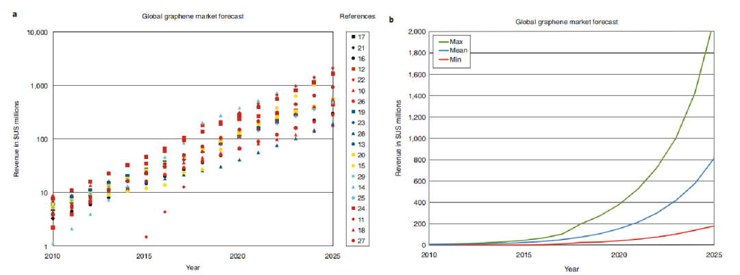 市场信息是定义此类路线图的技术要求的重要组成部分。以石墨烯为例,有许多市场可供研究选择,市场价值估计范围很广,2025年的市场价值从约1.8亿美元到21亿美元不等。为了挖掘发展趋势,人们将2013年和2019年20个市场调研的结果合并到一个市场分析图中。可以预测到2025年平均增长率约达40%,如图1a所示。这也表明全球市场需求从2015年的US$15–50million,到2025年左右约可以达到US$200–2,000 million美元。需要注意的是,图中描绘的是“石墨烯的市场价值”。在这里,这些预测的数字代表的是材料本身而不是最终产品的收益。