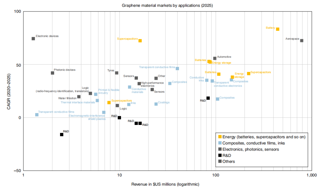 为了评估石墨烯在不同应用市场中的潜力,研究者们比较了按不同应用场景对2025年的市场预测。图2展示了复合年增长率(CAGR)与不同应用领域盈利预测的关系图。普遍认为,石墨烯在电池和超级电容器等储能器件应用(黄色方块)中具有很高的市场潜力(> 1亿美元)。石墨烯复合材料和导电膜/电极(蓝色方块)预计将会有较高的复合年增长率(〜30%)和较高的盈利,而石墨烯基(光电)电子和传感器(灰色方块)预计将具有> 20%的较高的增长率,但盈利不高。随着越来越多的产品进入市场,石墨烯的研发(黑方块)预计将以约0%的恒定复合年增长率持续增长,这表明石墨烯可能在某些领域已经超出了单纯的研发阶段。
