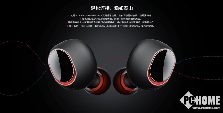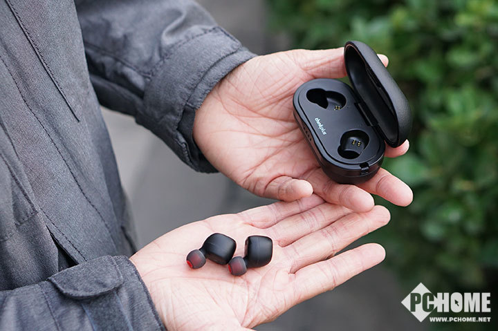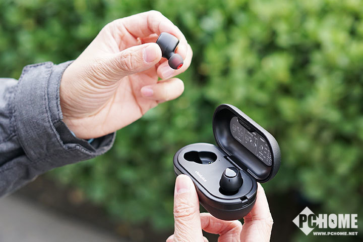 两个耳机主体,依旧是采用经典的红黑搭配设计,在充电时,耳机按钮处还会透出红光,十分有科技范。耳机整体采用了磨砂材质工艺,按钮处为黑色亮面处理,耳塞部分中间的橡胶则是红色。