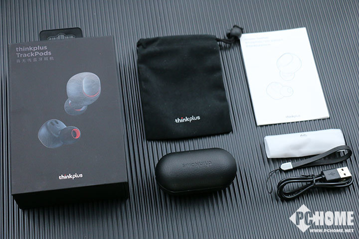 耳机的包装部分与think大家族的风格一致,正面和侧面都是黑色,背面耳机介绍部分则是经典的红色。配件包括充电盒、耳机一对、收纳袋、挂绳、耳帽、数据线和说明书。可以说是比较良心了,随机赠送像绒布收纳袋、挂绳这类的配件,其实并不多见。