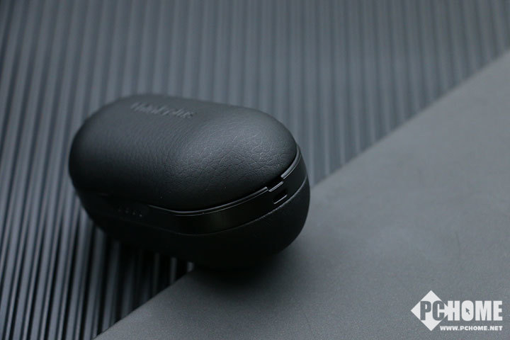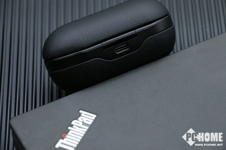 耳机部分先来说说充电盒,与其他真无线蓝牙耳机相比,thinkplus TrackPods无线蓝牙耳机的充电盒做工十分讲究,这里必须要给好评。外壳通体为黑色,非常有商务气息。盒体本身大部分采用了PU皮质设计,手感细腻、防滑不说,整体质感也是很值得一说的。