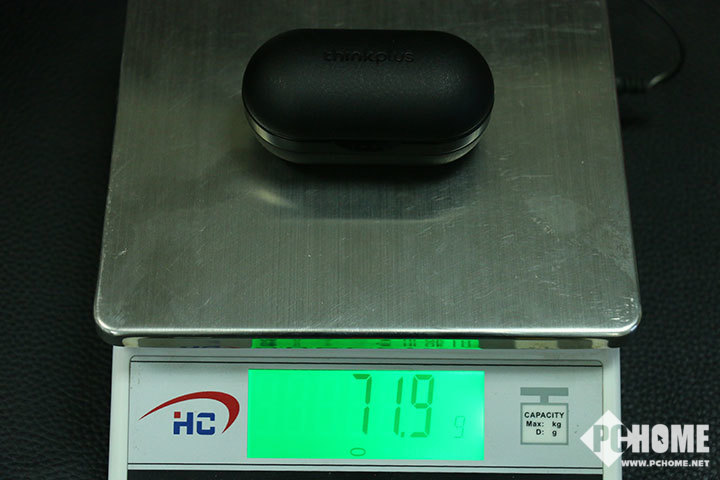 再说耳机部分之前,笔者也特意对这款产品进行了称重,其中thinkplus TrackPods无线蓝牙耳机+充电盒总重量约为72g,大约是目前一部智能手机重量的三分之一,而单独一个充电盒的重量为63g。整体还是非常轻便的,日常携带并不会增加什么负担。