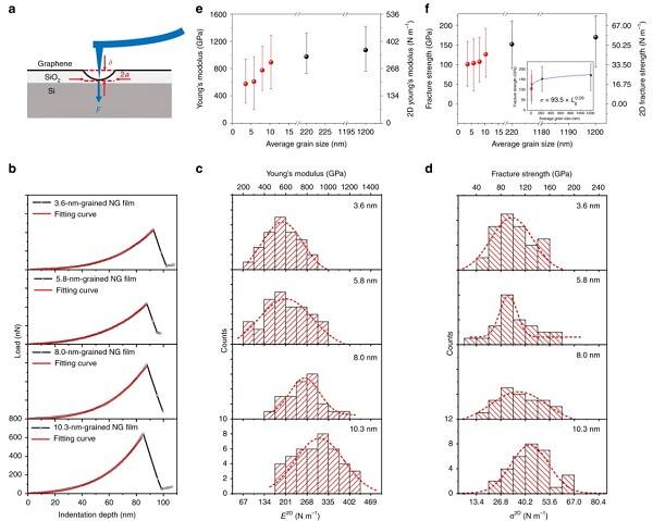 (d) 不同晶粒尺寸的纳米晶石墨烯薄膜的断裂强度;