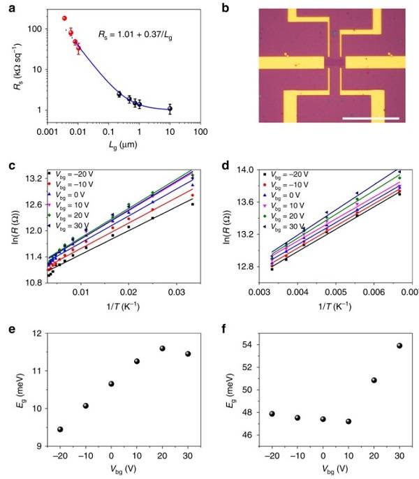 (f) 3.6 nm晶粒尺寸的纳米晶石墨烯薄膜的禁带宽度随着栅压变化的关系;