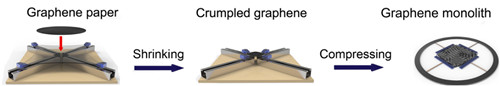 近日,中国科学院宁波材料技术与工程研究所表面事业部功能碳素材料团队制备了一种基于垂直排列石墨烯结构的具有高导热系数低压缩模量的热界面材料。该材料的制备过程如图1所示:对抽滤的石墨烯纸施加横向机械力,使石墨烯具有褶皱结构,然后施加压力得到密实的石墨烯导热垫。该方法使得石墨烯纸的取向由水平变成垂直,实现了石墨烯纸水平传热到垂直传热的转变。